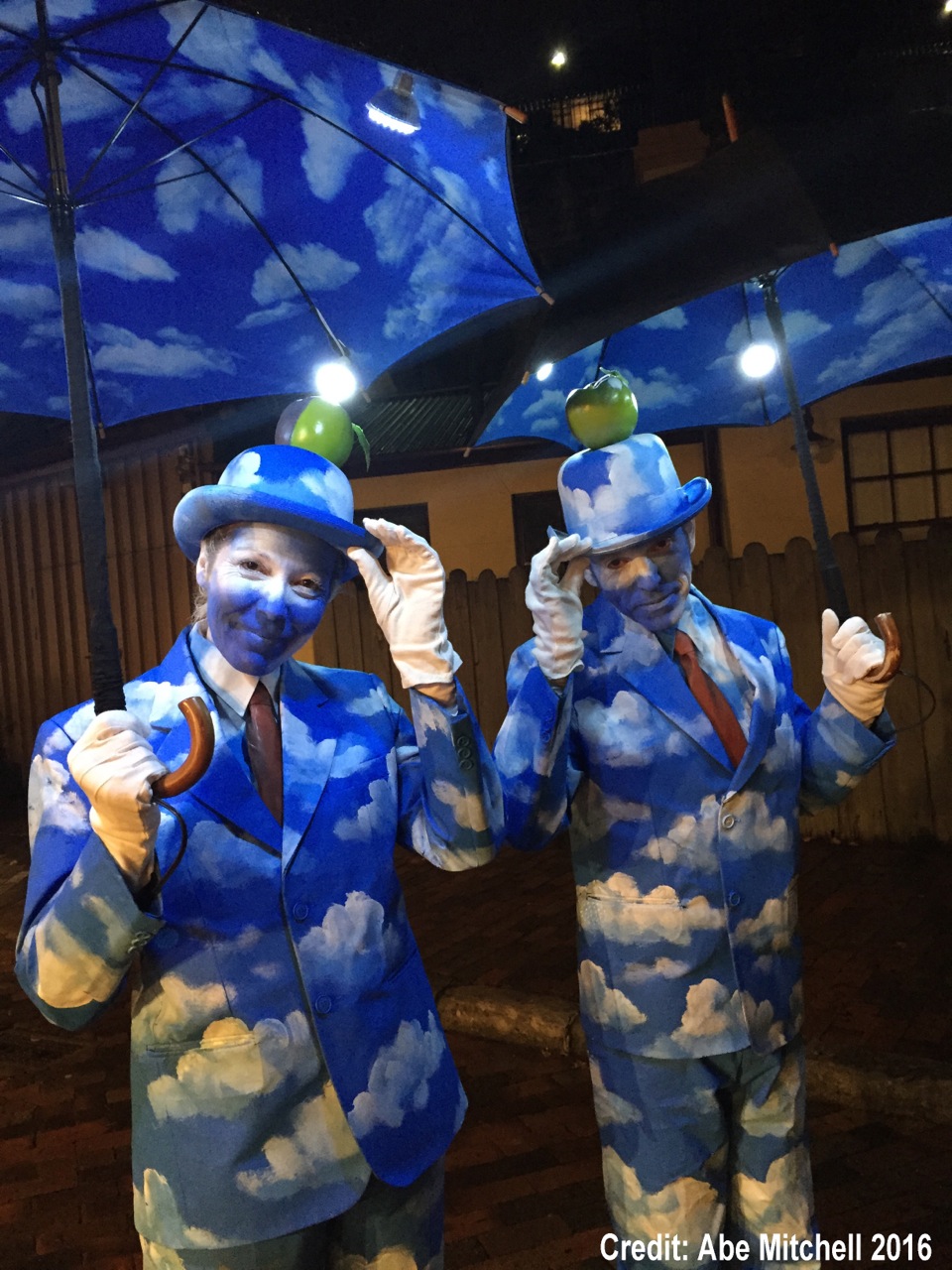 A homage to the popular Belgian surrealist artist, Rene Magritte, they incorporate the artist’s signature elements – the Businessman, the Umbrella, the Apple and the magnificent blue sky and perfect clouds.